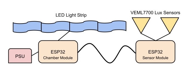 To meet the client’s design criteria, we developed a two-part system with a sensor module and a chamber module connected via cable. The entire solution is designed to be at least IP54 compliant. The sensor module collects real-time outdoor light data and transmits it to the chamber module, which modulates LEDs around the incubation vessel to replicate the detected intensity. The system includes wireless interfacing, manual control, and data logging for added functionality.