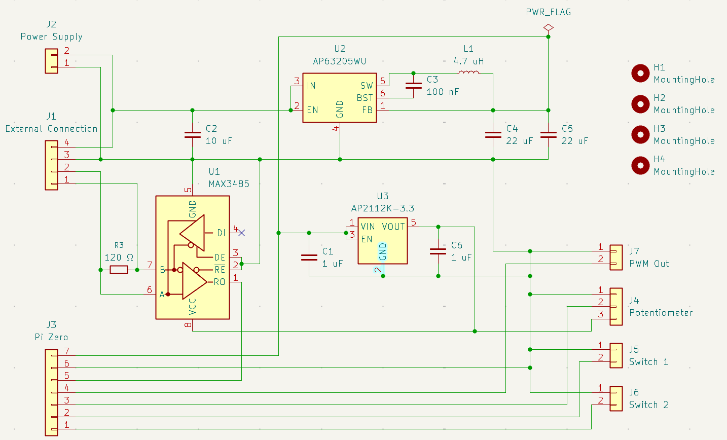 Above is an electrical schematic I designed for the chamber component. The chamber module is designed around a Raspberry Pi Zero 2 due to its powerful quad-core ARM processor and storage capabilities. The circuit utilizes both an AP63205 fixed-voltage buck converter and AP2112-3.3 LDO to provide both 5V and 3.3V to the various components including another MAX3485 RS-485 transceiver, front IO, and the Pi. Data from the sensor module is received and converted to UART which the Pi uses to calculate a PWM duty cycle that controls a MOSFET driver board for the high amperage 24V LEDs.