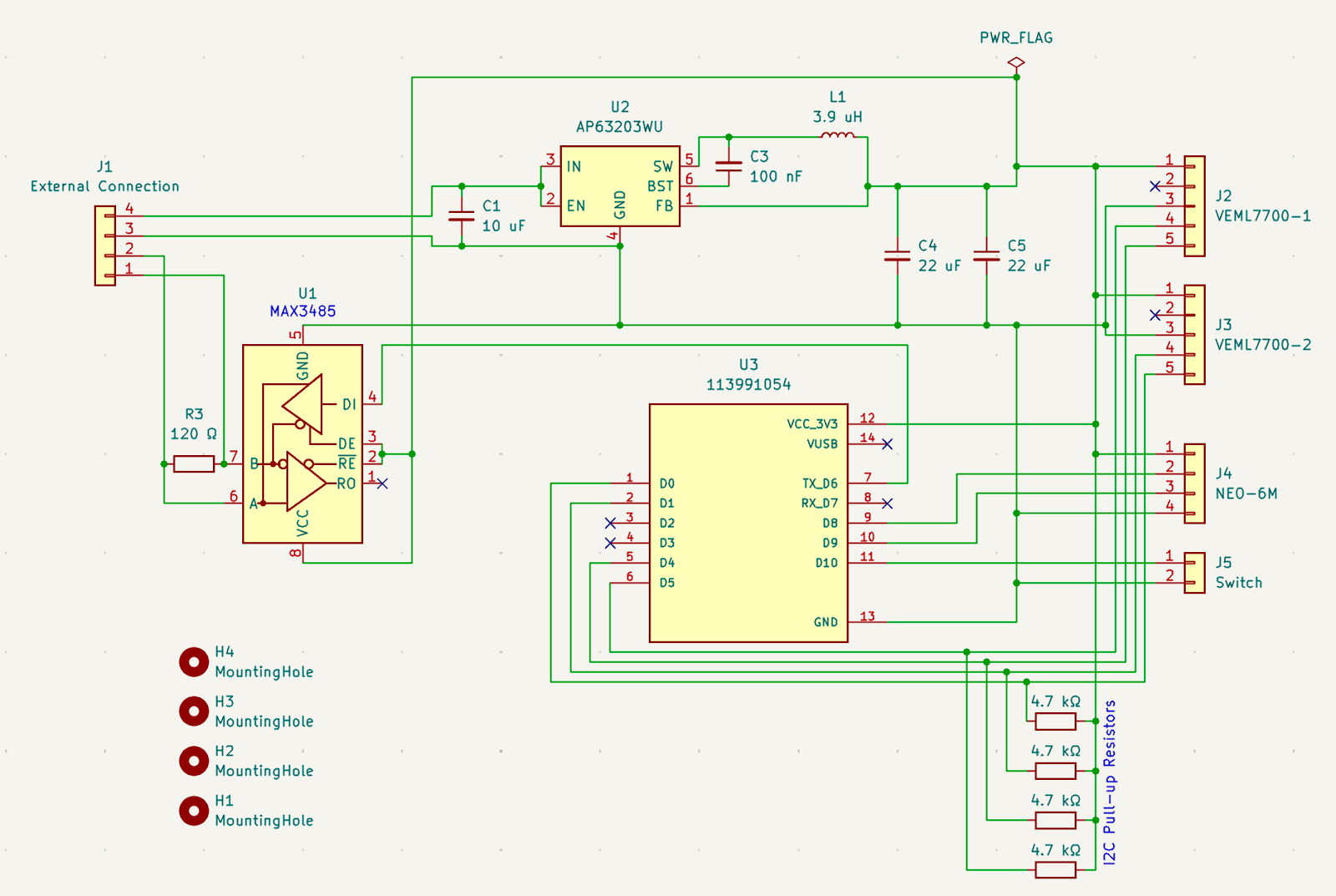 Above is an electrical schematic I designed for the module component. The sensor module is designed around an ESP32-C3 board for its low-power consumption and integrated wireless capabilities. The MCU is wired to two VEML7700 lux sensors via I2C to collect solar intensity data which is then transmitted out via UART to a MAX3485 RS-485 transceiver. Both power and data lines are fed into the module via an RJ45 interface. An AP63203 fixed-voltage buck converter efficiently drops the 24V VIN to the 3.3V required by the module circuit.