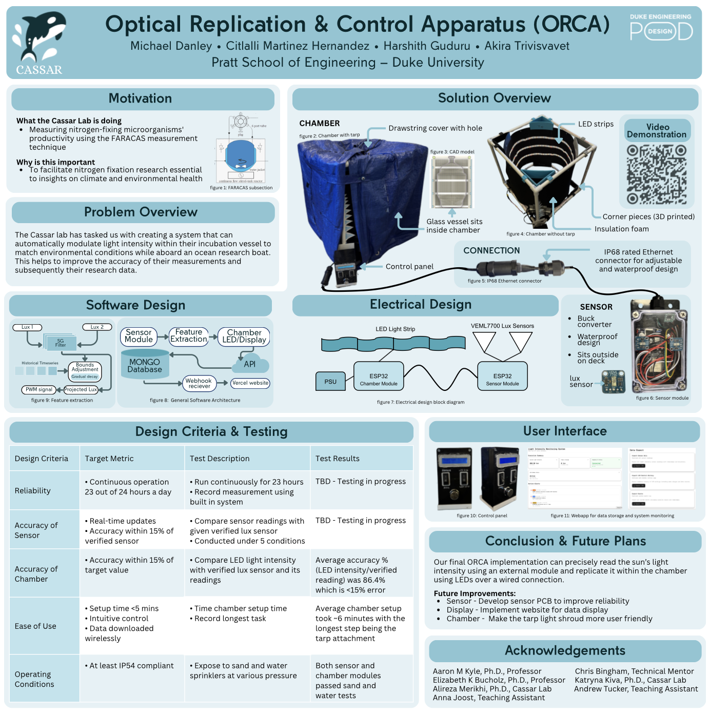 ORCA (Optical Replication & Control Apparatus) is a system designed to emulate real-time environmental light intensity inside an incubation vessel aboard a marine research boat. I was in charge of the design, fabrication, and testing of the electrical subsystem. Our team delivered the first iteration of the design to the CASSAR lab in Fall 2025 with future plans for development in Spring 2026. The lab plans to implement our technology to aid in their research on nitrogen fixation, a biological process vital to our understanding of global warming.