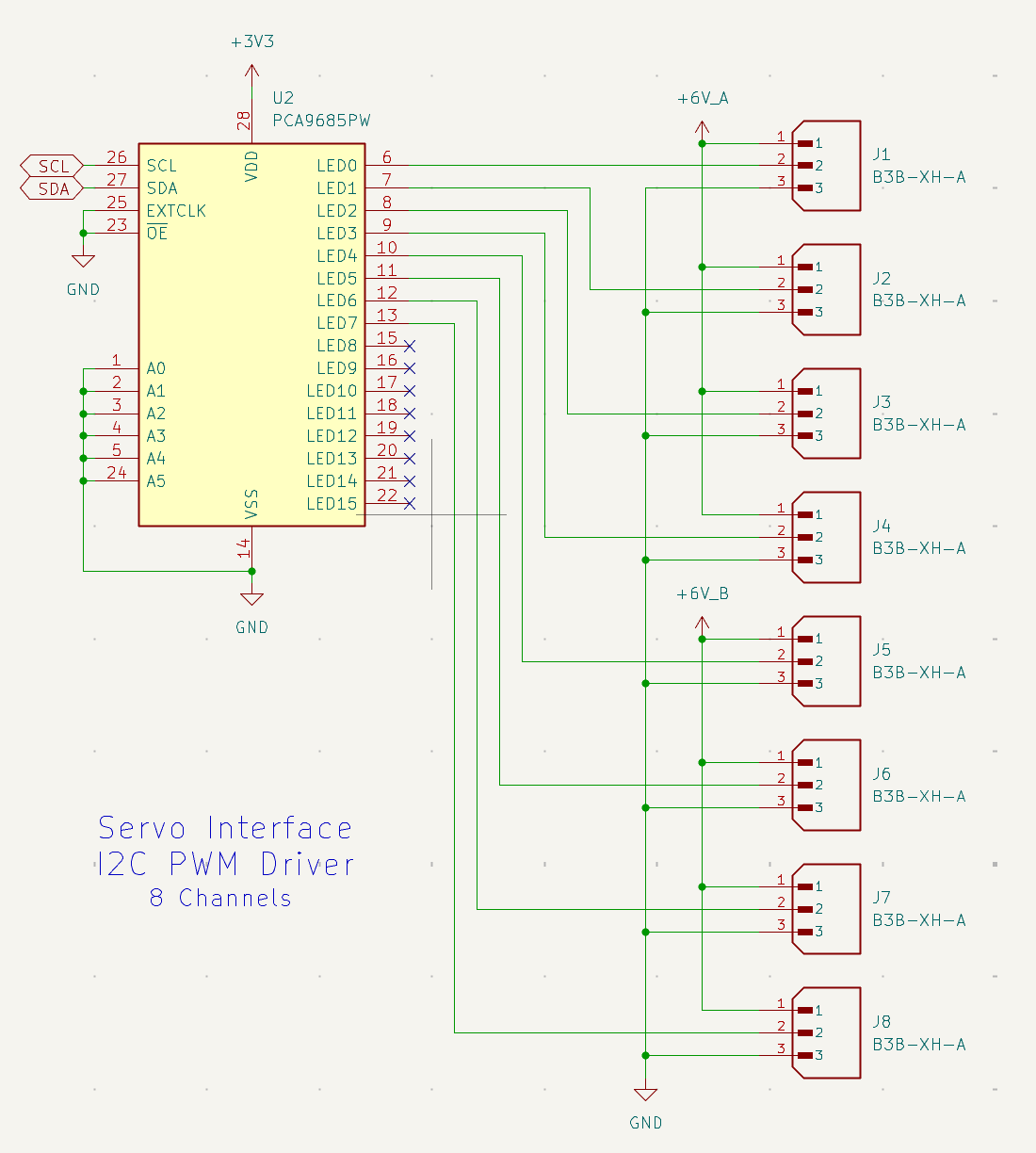 - Voltage Rails: Two independent AP63300 converters supply +6 V to separate servo banks, while an AP63205 converter generates the +5 V rail used by the ESP32-C3 and the pressure transducers.