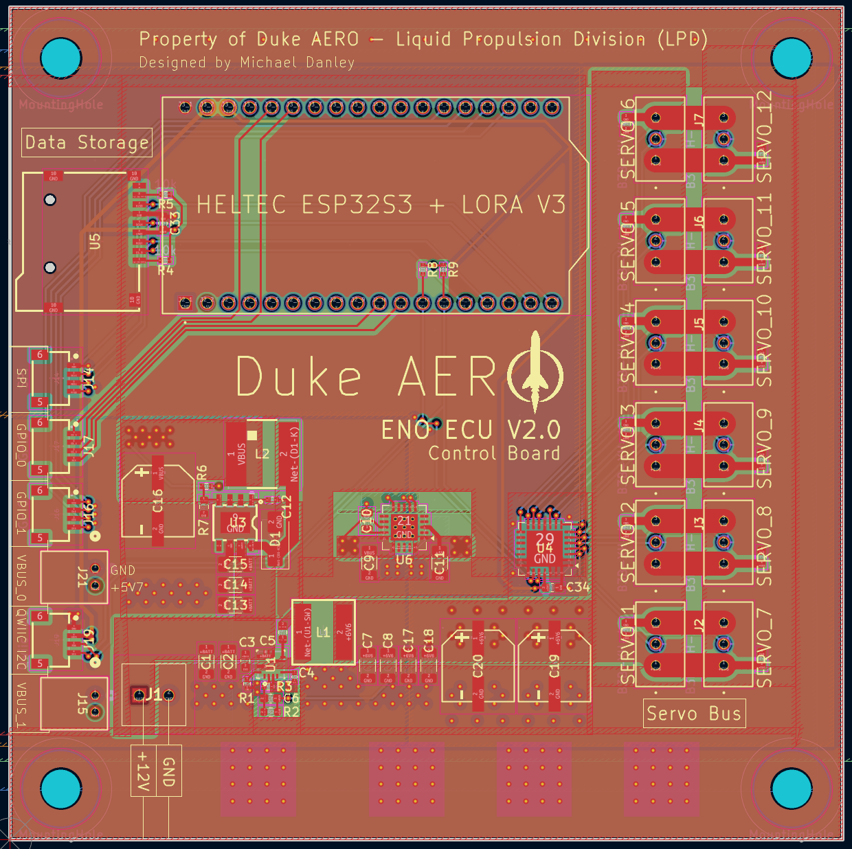 The ENO ECU V1.0 focuses on high-frequency data acquisition, power management, and servo control. Powered by an ESP32-C3 MCU, the board can use WiFi to communicate with a connected laptop to both send telemetry and recieve wireless servo commands. This iteration also contains additional connectors to interface with an external DAQ.