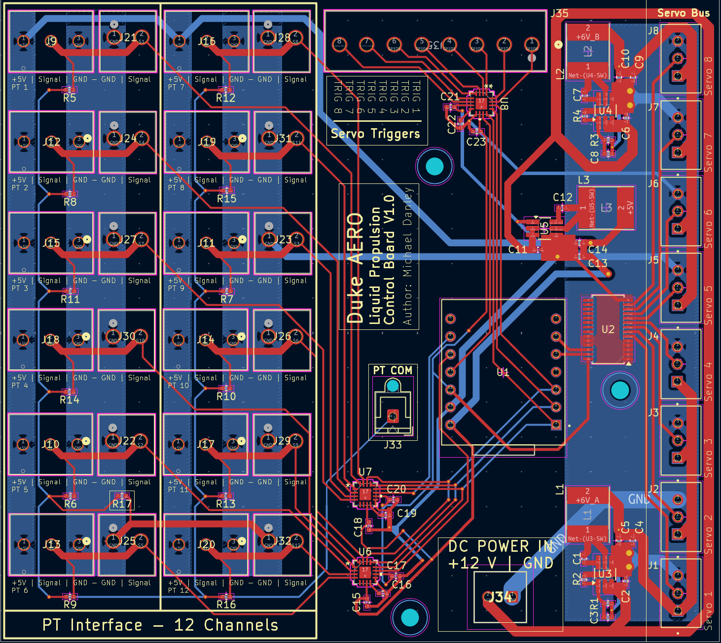 This project is part of the Duke AERO liquid propulsion test platform. To increase the reliability of the electrical system during test runs of the team's experimental liquid rocket engine, I am developing a PCB designed to perform analog signal sampling, power distribution, and valve control.