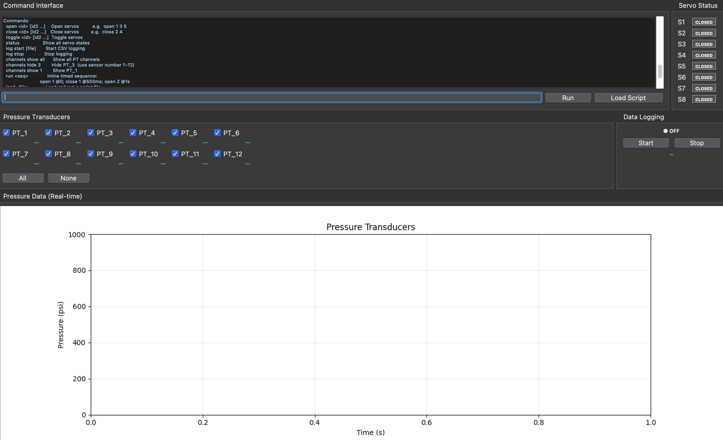 The user interface is a Python program that wirelessly pairs with the ECU and is capable of streaming live telemetry data and sending servo commands. A custom CLI allows the user to interact with the system while a real-time graphical display plots calibrated pressure data from up to twelve transducers using a configurable moving average filter. The application supports timed command sequences and script execution for automated valve actuation, along with live channel selection and servo state indicators. Telemetry and actuator states can be logged to CSV for post-test analysis, making the tool suitable for both live monitoring and structured experimental runs.