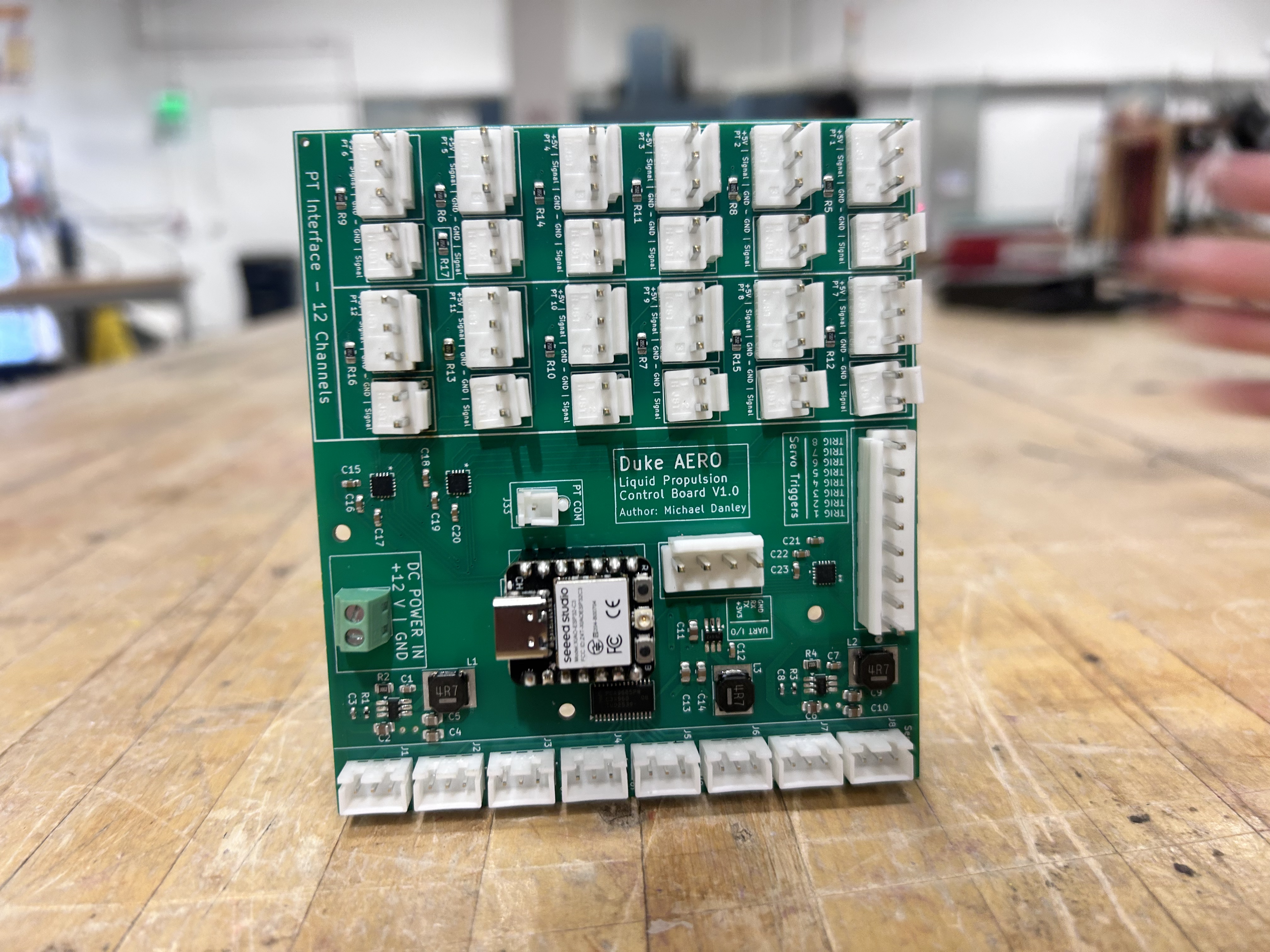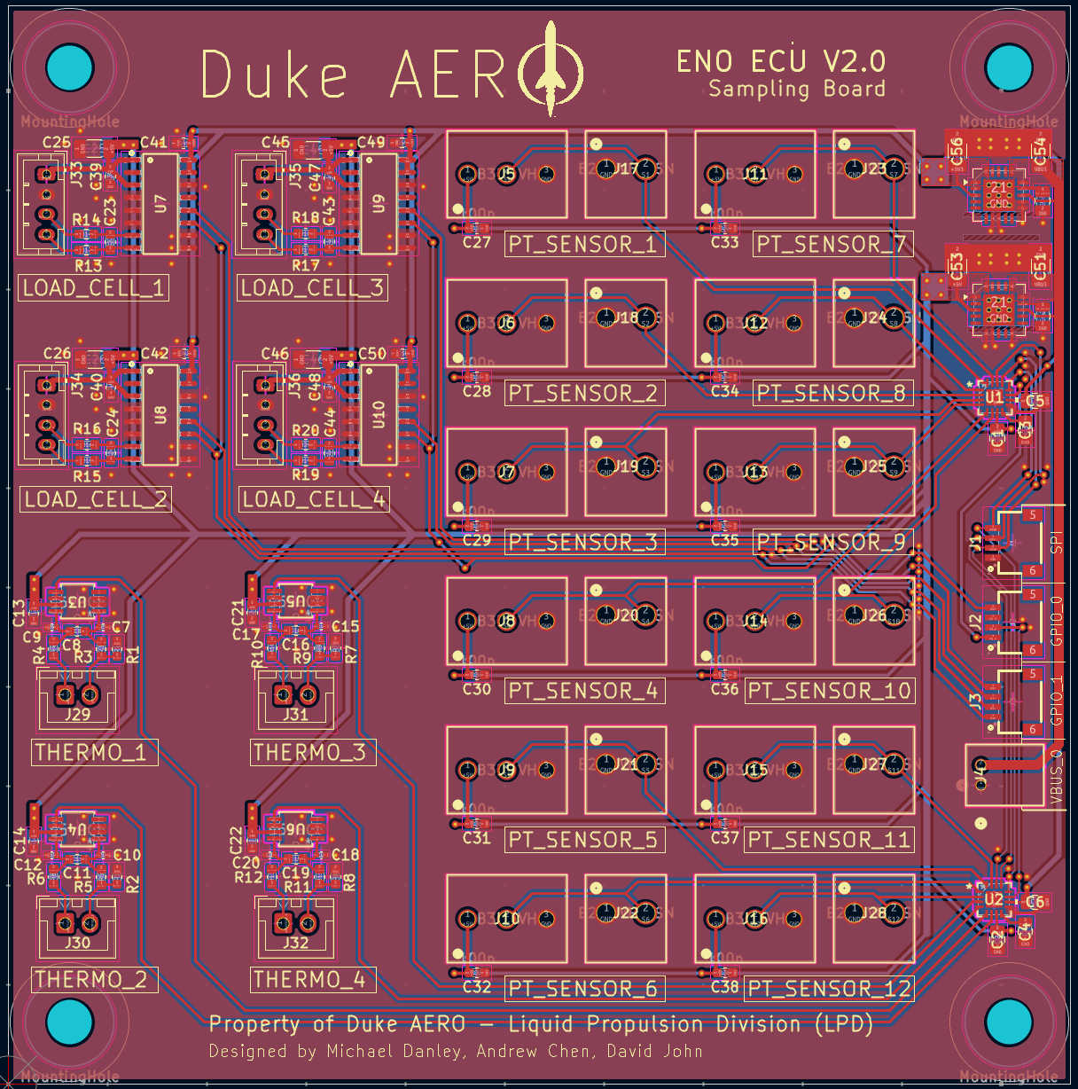 The ENO test platform is built around a network of pressurized tanks, tubing, valves, and sensors. The previous system consisted of a mess of cables, various protoboards, an Arduino UNO, and an external DAQ. The result was a system completely inadequate for the reliability and consistency required by a liquid rocket engine. Each test required hours of wiring and troubleshooting. To improve both reliability and simplicity, I designed a fully integrated engine control unit PCB capable of handling all the previous functionalities on a single dedicated board. Currently, I'm leading a team in developing a 2nd iteration of the board with additional features and modifications to issues found during testing of V1.0.