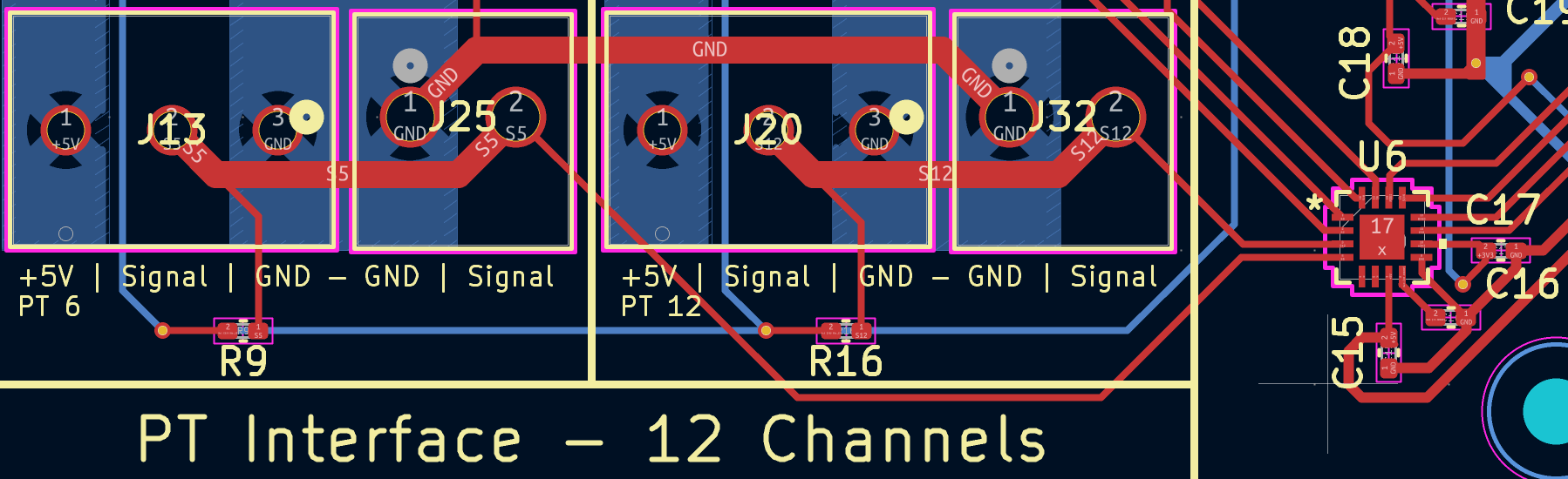 - ADC Integration: Two TLA2518 ADCs provide onboard sampling to validate sensor readings and help diagnose wiring issues between the PCB and the measurement unit.